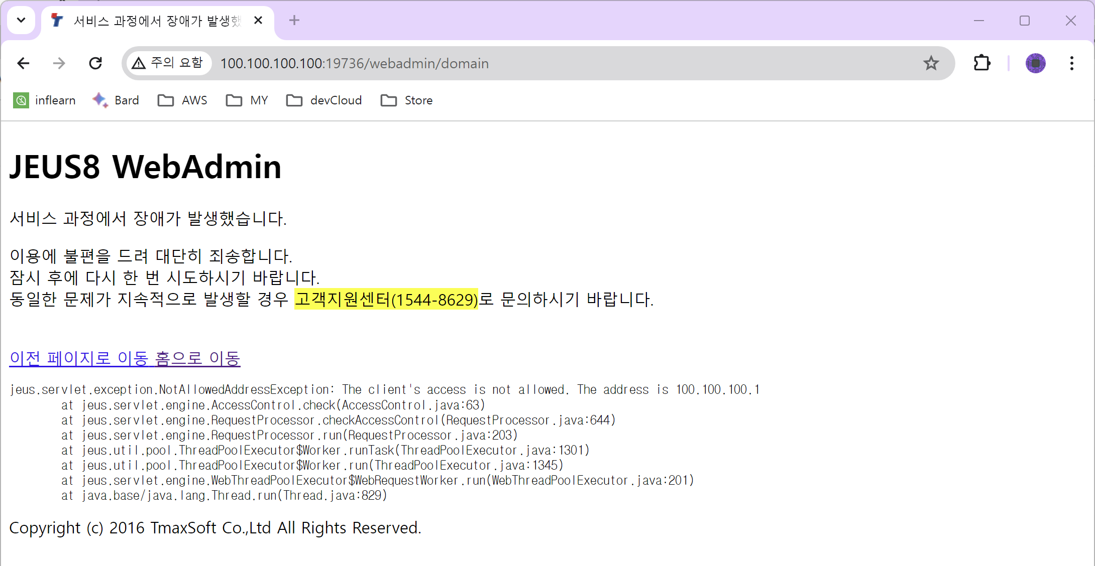 jeus.servlet.exception.NotAllowedAddressException: The client's access is not allowed. The address is 100.100.100.1