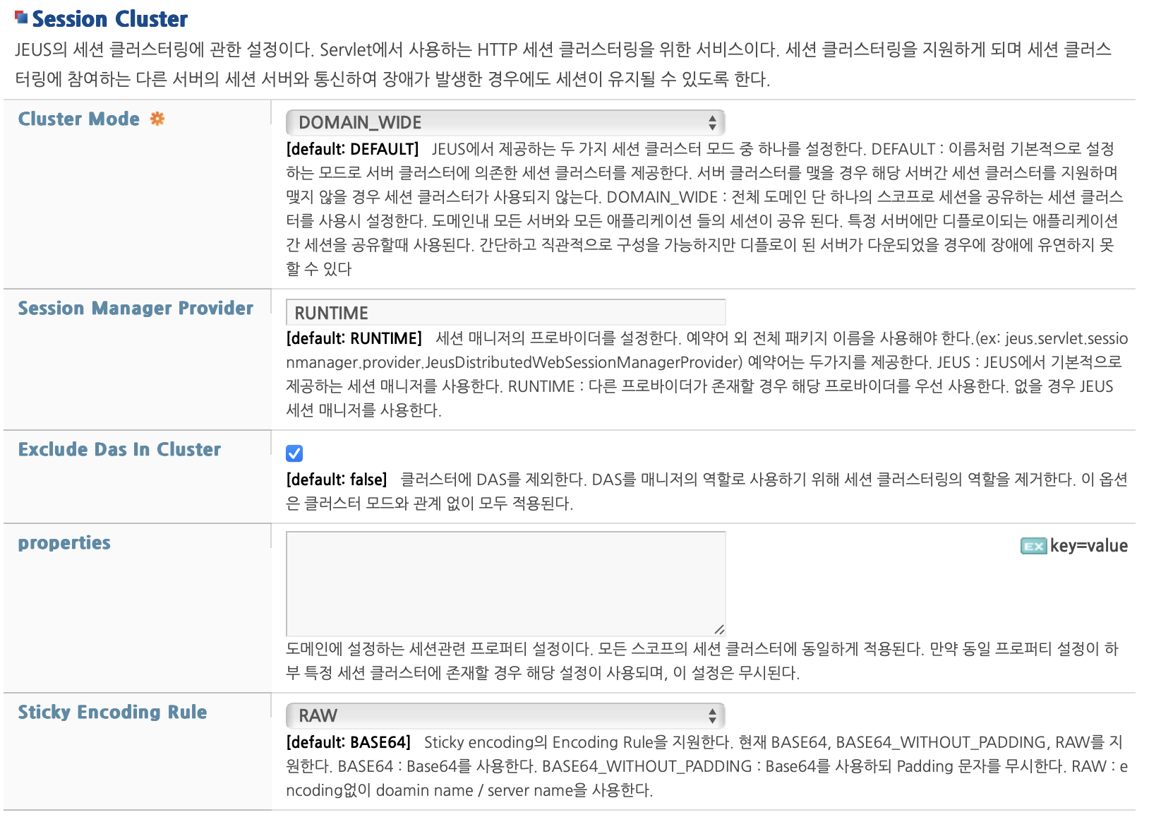 • DOMAIN_WIDE 모드를 클러스터링 설정과 동시에 적용할 경우, 클러스터 설정이 무시될 가능성이 있습니다.
