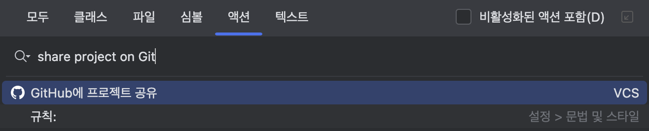 #1 Action 검색창에서 'share Project on GitHub' 검색