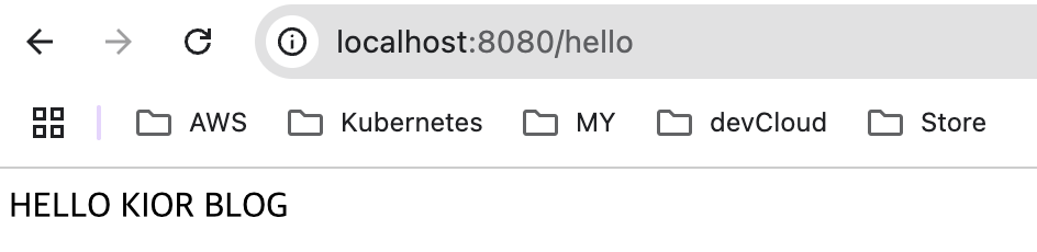 /hello로 들어오는 GET 요청을 처리합니다. - return "HELLO KIOR BLOG!": 텍스트 응답으로 해당 문구가 출력됩니다.