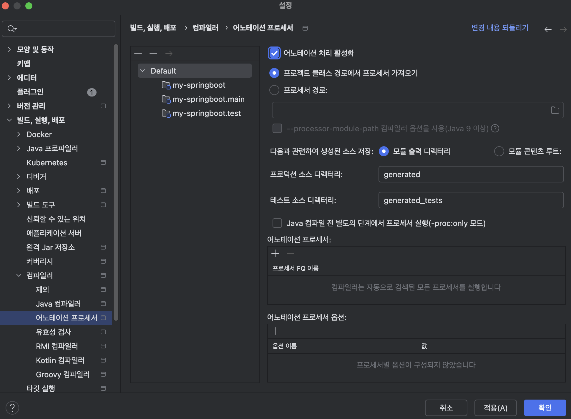 ✔ "어노테이션 처리 활성화" 체크해주셔야 해요!
