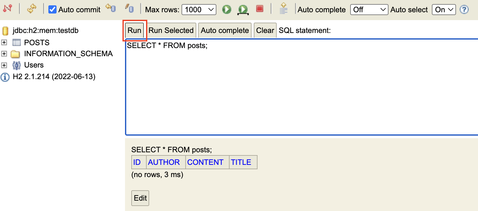 TIP: H2는 인메모리 DB이므로 애플리케이션을 재시작하면 데이터가 초기화됩니다.