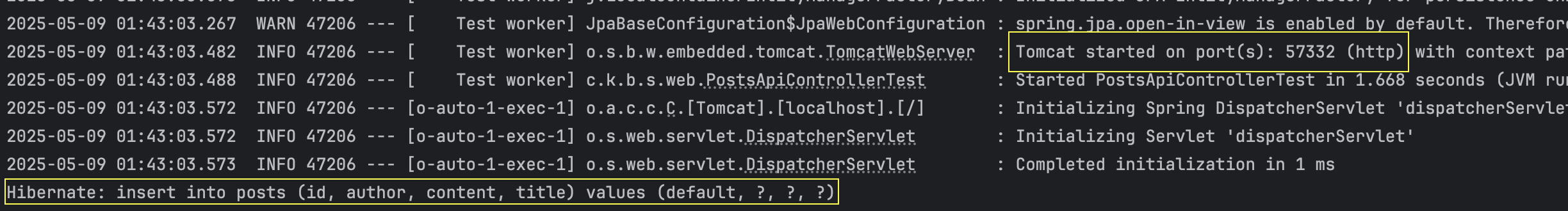 그러므로 JPA 테스트할 때는 @SpringBootTest, TestRestTemplate를 사용하면 됩니다.2. RANDOM_PORT 실행과 insert 쿼리 동작을 확인할 수 있습니다.